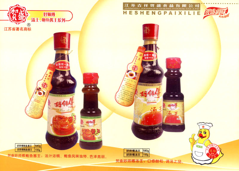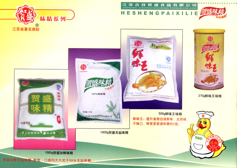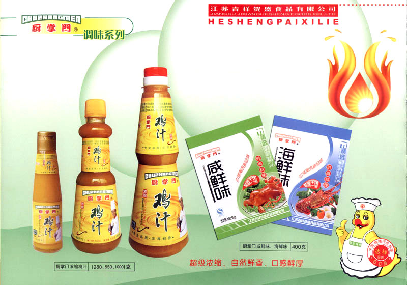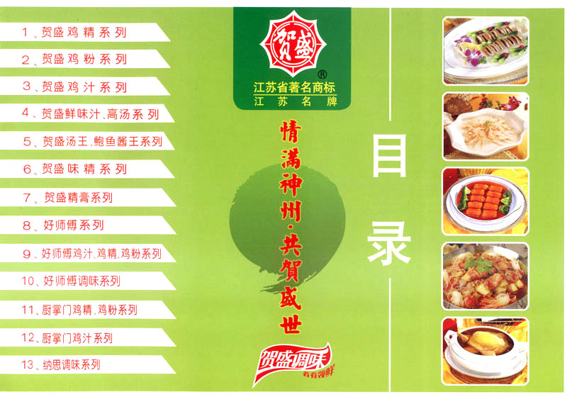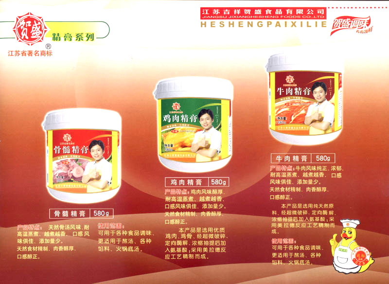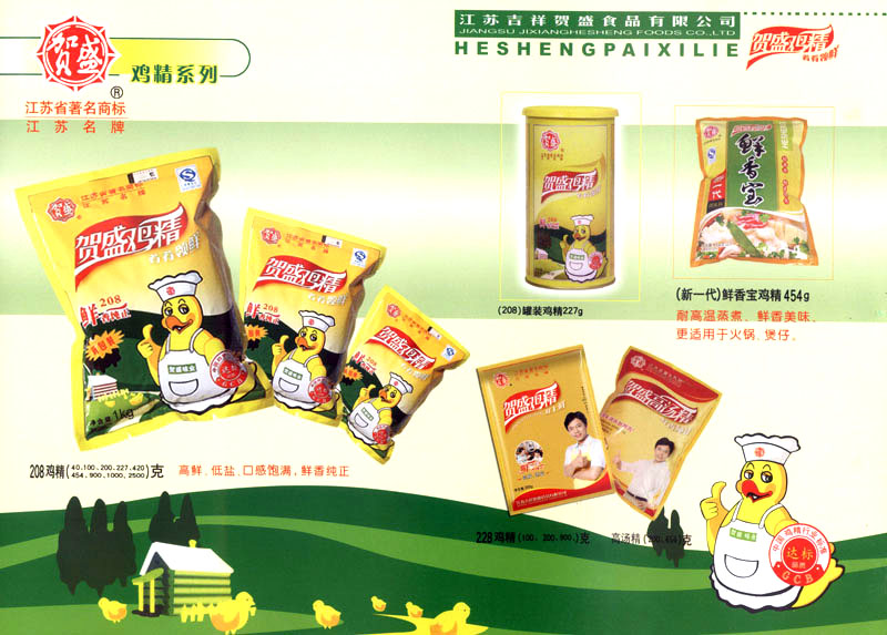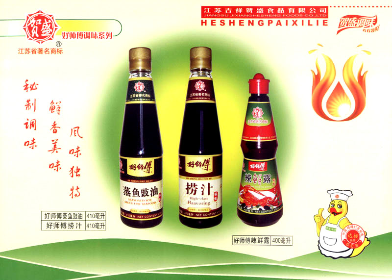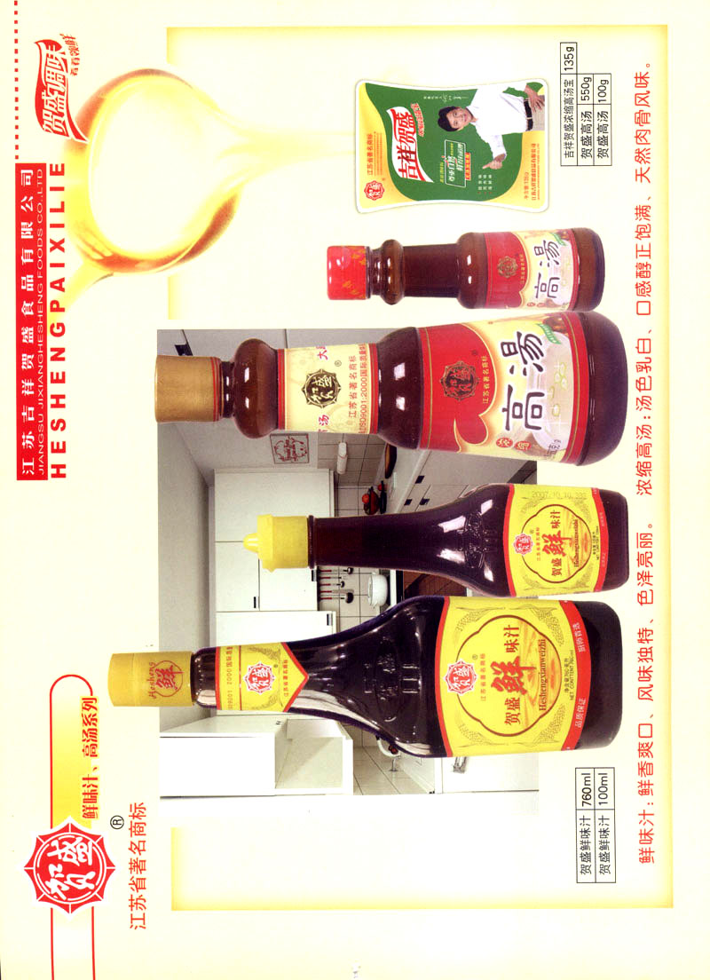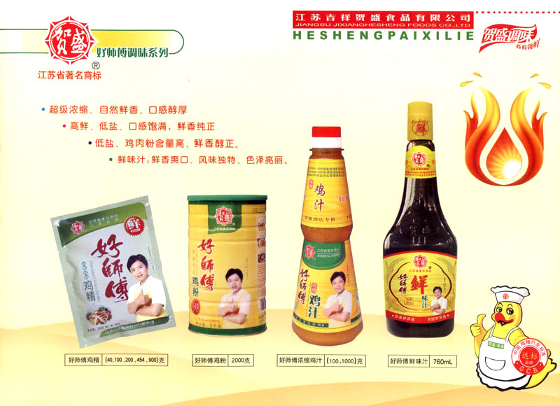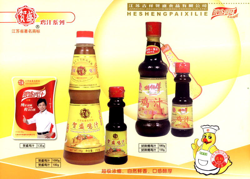 江蘇吉祥賀盛食品有限公司是一家中國專業(yè)餐料知名制造商,公司座落在經(jīng)濟高度發(fā)達“長三角”的常州市,緊靠312國道,滬寧高速與沿江高速交匯處,距常州火車站及長江水運碼頭20千米,交通十分便利。公司占地面積23500平方米,花園式工廠、廠房面積18500平方米,現(xiàn)在員工330余名,其中擁有中、高級職稱管理和技術人員58名,生產(chǎn)場地均按食品和藥品GMP要求設計、全封閉車間、中央空調(diào)系統(tǒng)、閉路電視監(jiān)控系統(tǒng)。目前已建成成三條雞精,雞粉生產(chǎn)線。一條雞汁生產(chǎn)線。一條鮮味汁生產(chǎn)線。一條醬汁精膏類生產(chǎn)線,規(guī)劃年生產(chǎn)能力達30000噸。 “賀盛”品牌取自《詩·大雅·下武》中“受天之祜、 四方來賀”;《易經(jīng)》中“富有謂之大業(yè),日新之謂盛德”,賀盛企業(yè)師法源遠流長中華飲食文化,融匯中西健康美食調(diào)味。相繼研發(fā)生產(chǎn)出高品質(zhì)的“賀盛牌”味精、雞精、雞粉、雞汁、湯王、鮑魚醬王、鮮味汁調(diào)味素和各種風味熱反應精膏等系列產(chǎn)品。二十年來“賀盛”產(chǎn)品質(zhì)量獲得廚藝界專業(yè)人士和消費者的一致好評和高度認可。 賀盛企業(yè)和產(chǎn)品相繼榮獲1995年“首界中國國際食品博覽會金獎”,2001年企業(yè)通過ISO-9001國際質(zhì)量體系認證,2003年江蘇省“計量保證確認單位”,2004年獲得自營出口權(quán),2005年賀盛雞精榮獲“江蘇名牌產(chǎn)品”,2006年賀盛商標被評為“江蘇省著名商標”,2007年通過HACCP認證,全部產(chǎn)品均通過QS食品安全認證,并積極努力爭創(chuàng)中國名牌,中國馳名商標。 公司銷售網(wǎng)點建設發(fā)展迅速,相繼組建上海、南京、河南、海南、新疆全資分公司;辦事處、經(jīng)銷商覆蓋全國,并出口日本、香港及東南亞地區(qū)。二十年來,在公司總裁周國林先生帶領下,全體同仁秉承“厚德載物、自強不息”宗旨,發(fā)揚“以人為本、科技創(chuàng)新、自我加壓、爭創(chuàng)一流”的企求精神;致力于傳承中華飲食文化,融化西方美食精粹,不斷的研發(fā)、創(chuàng)新,奉獻更多更好的調(diào)味料,讓生活更有滋味。公司總裁周國林先生攜全體員工熱誠歡迎各位新老朋友蒞臨指導,洽談合作!