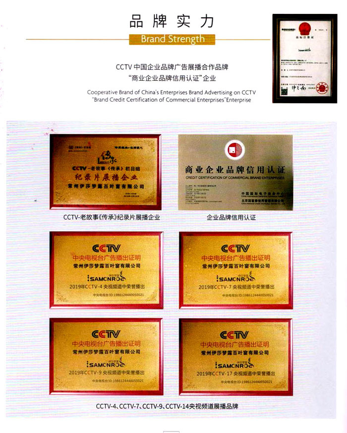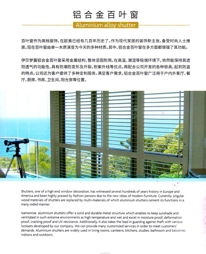 常州伊莎夢露百葉窗有限公司成立于2010年,是一家專業(yè)從事高端鋁臺金百葉窗以及百葉窗五金配件研發(fā)、生產(chǎn)、銷售和服務(wù)的現(xiàn)代化企業(yè)。公司本著“誠信為本,客戶至上”的原則。產(chǎn)品遠銷大洋洲、歐洲、美洲等多個國家,并得到客戶的一致認(rèn)可。 目前公司具有比較先進的生產(chǎn)設(shè)備及檢測手段和完善的質(zhì)量保證體系和管理制度,在這基礎(chǔ)上公司每年加大研發(fā)投入,陸續(xù)獲得十多項專利。今后公司還將繼續(xù)堅持品牌發(fā)展戰(zhàn)略,提升市場能力,為消費者提供更加優(yōu)質(zhì)的產(chǎn)品和服務(wù)。地址:江蘇省常州市經(jīng)濟開發(fā)區(qū)橫山橋鎮(zhèn)朝陽村大橋工業(yè)園509號電話:0519-88763142 傳真:0519-88762898網(wǎng)址:www.chinaismr.cn郵箱:Isamonroe-liu@outlook.com 48980807@qq.com