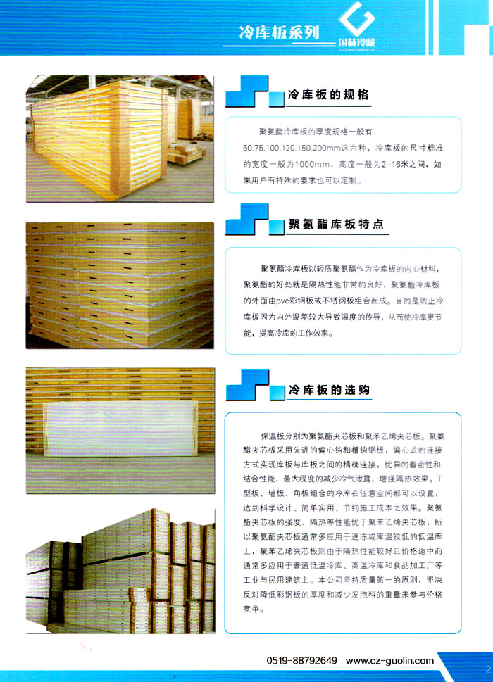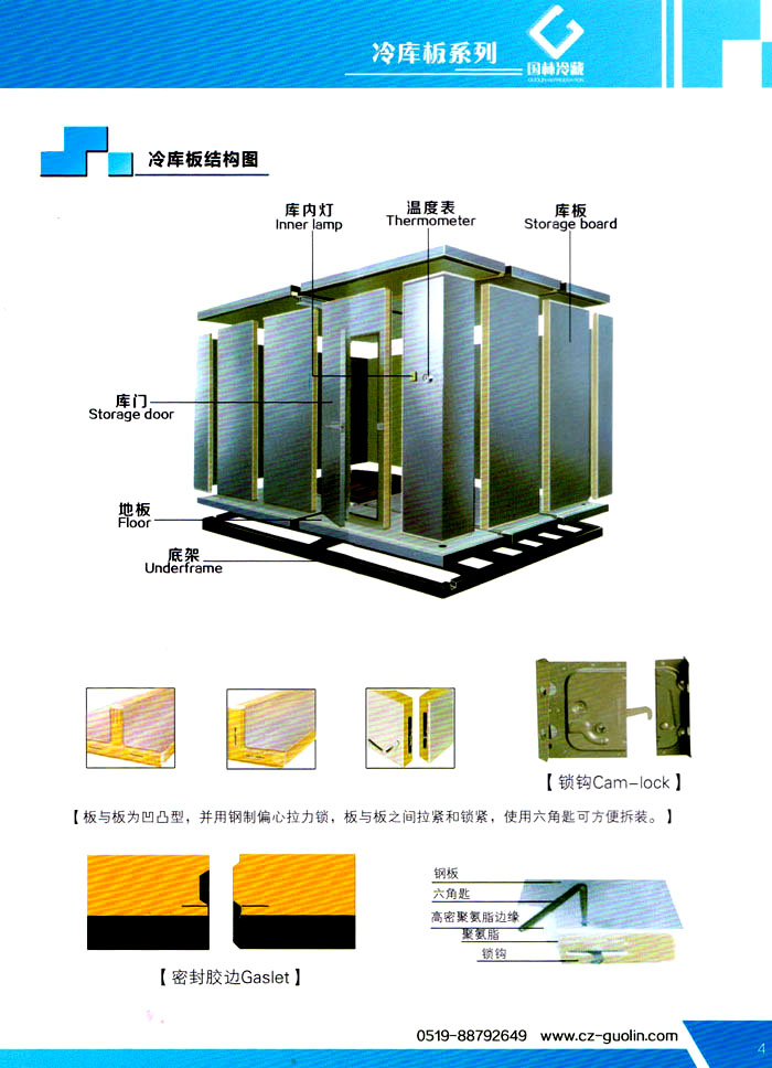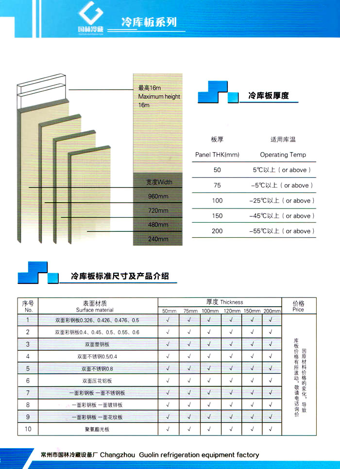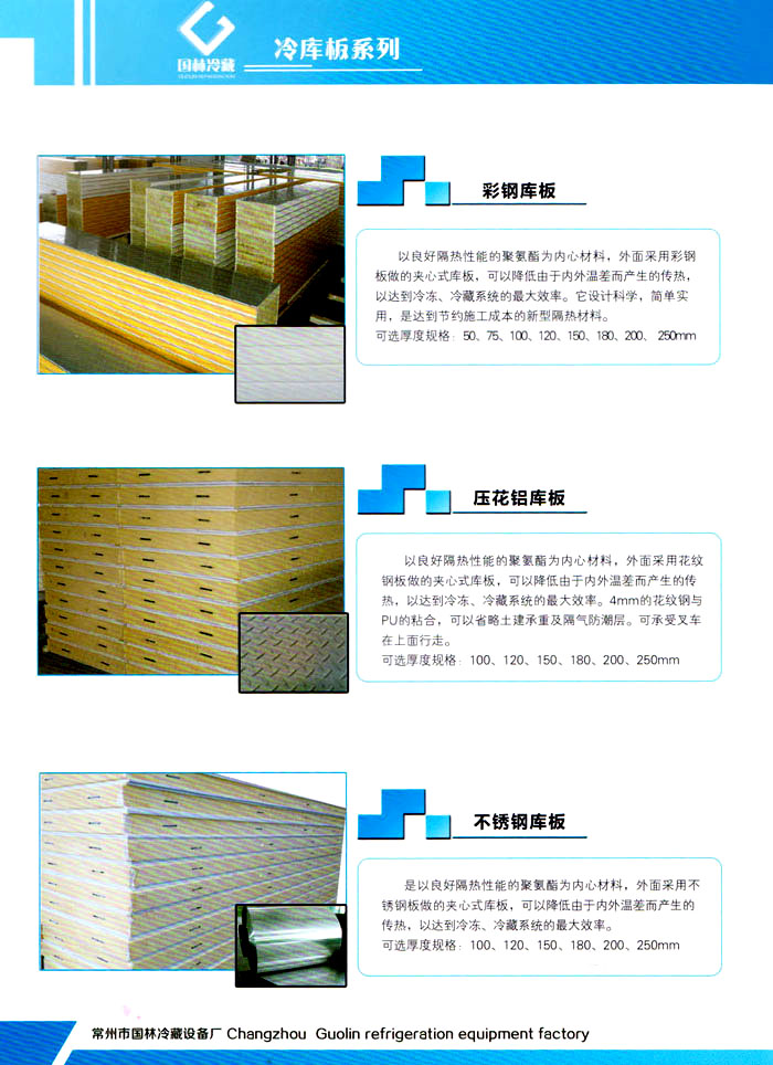 常州市國林冷藏設(shè)備廠(原武進(jìn)長虹冷藏設(shè)備廠)成立于1995年,地處江南水鄉(xiāng)中國富饒的“長江三角洲”中心區(qū)域—江蘇常州,滬寧高速、沿江高速、312國道,交通快捷,即刻到達(dá)。 國林冷庫:公司通過了ISO9001:2000質(zhì)量體系認(rèn)證,國林冷庫多次獲得“江蘇省優(yōu)質(zhì)產(chǎn)品”稱號(hào),全國質(zhì)量服務(wù)AAAAA示范單位,并且是中國食品網(wǎng)、阿里巴巴,空調(diào)制冷誠信通會(huì)員企業(yè),并與全國多家設(shè)計(jì)院技術(shù)合作,本廠的誠信服務(wù)獲得了廣大客戶的認(rèn)可。 國林冷庫:中國制冷行業(yè)的十大冷庫制造商之一,中國制冷重要工業(yè)生產(chǎn)基地。本公司***生產(chǎn)保溫庫板及冷庫制冷成套設(shè)備,庫板材料涉及不銹鋼、彩鋼板、玻璃鋼板、保溫聚氨脂板。年產(chǎn)量3000多臺(tái),庫板30多萬平方,歡迎新好客戶前來訂購。 國林制冷:公司始終堅(jiān)持:“質(zhì)量為上,追求品質(zhì)”的生產(chǎn)方針;始終信奉:“客戶為先,服務(wù)為本”的經(jīng)營理念。我們愿同廣大的新老客戶在新的世紀(jì)里,共同發(fā)展,利益雙贏,再創(chuàng)輝煌。 常州市國林冷藏設(shè)備廠***生產(chǎn)7.5公分,10公分,12公分,15公分,20公分的聚氨酯冷庫板,面板包括彩鋼板、不銹鋼板、壓花鋁板等各種板材,各種冷庫半埋門及平移動(dòng)門,各種鐵排管和鋁排管,價(jià)格優(yōu)惠,有需要的可以聯(lián)系我金文燁18761183807