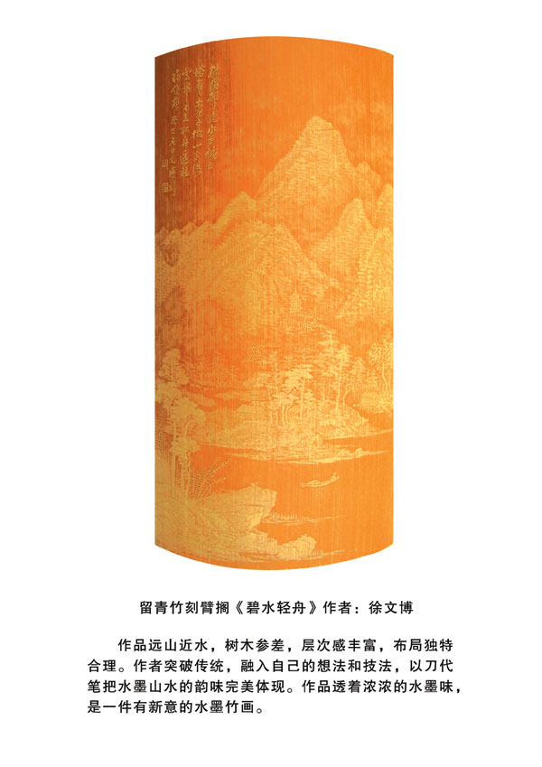 徐博(藝名文博),1973年生,江蘇武進人,江蘇省省名人,高級工藝美術(shù)師,常州市留青竹刻非遺傳承人,常州工藝美術(shù)家協(xié)會理事,被譽為當今中國最具創(chuàng)新意識的新銳竹刻家代表,多次獲得國家工藝美術(shù)大獎。酷愛留青竹刻的徐文博賞竹為樂,以竹詠志,借竹抒懷,悉心探索留青竹刻的藝術(shù)表現(xiàn)。在中國工藝美術(shù)大師蕭劍波的精心指導(dǎo)下,開創(chuàng)留青水墨山水之技法,更好的體現(xiàn)了竹刻淡雅清秀的藝術(shù)風格,并不斷汲取書畫、攝影、雕塑等藝術(shù)精華,不斷滋養(yǎng)藝術(shù)情趣,提升擴展胸襟人格的同時也逐步形成了其形神兼?zhèn),虛實相生,氣韻生動的藝術(shù)特點,作品為眾多的國內(nèi)外收藏家珍藏。