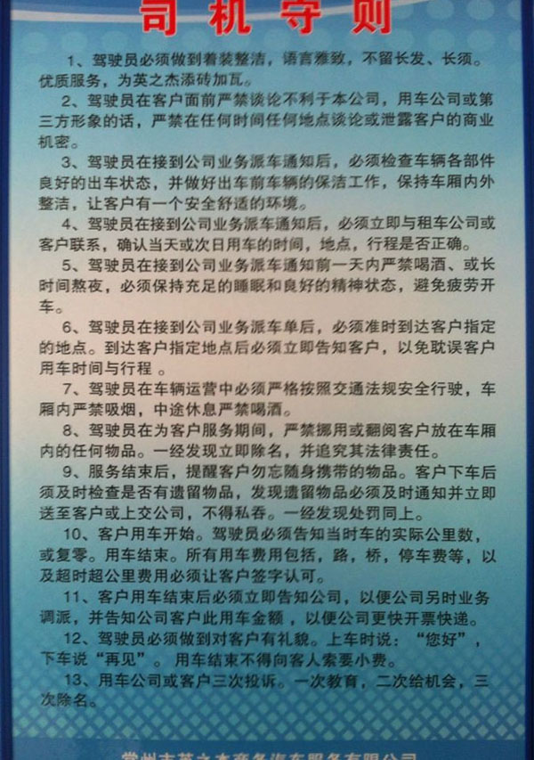 常州市英之杰商務(wù)汽車服務(wù)有限公司是一家專業(yè)從事企事業(yè)單位重要接待任務(wù)、企業(yè)高檔旅游等用車服務(wù)、以及中、小型高檔汽車的租賃業(yè)務(wù)。具有省交通廳批準核發(fā)的客運企業(yè)資質(zhì)證書。多年來,本公司從行業(yè)管理要求出發(fā),結(jié)合本公司的實際情況,堅持“親和、誠信、專業(yè)、便捷”的服務(wù)品牌內(nèi)涵,注重團隊建設(shè)、車輛管理、安全管理和優(yōu)質(zhì)服務(wù)等,進一步提升本公司在我市客運行業(yè)中的良好形象。本公司著重在服務(wù)、安全管理上下功夫,從經(jīng)營管理、服務(wù)理念上找差距:從提高適應(yīng)市場的能力上做文章。扎扎實實地抓好各項管理工作,做強而不盲目求大,做憂而不盲目求全,一切以客戶需求為需求。目前公司與常武地區(qū)的多家大型企事業(yè)單位和上市公司(如國茂減速機集團、國泰鑄造集團、騰龍汽車零部件股份有限公司、石墨烯研究院、海斯町發(fā)動機零部件有限公司等企事業(yè)單位)建立了良好的租車合作關(guān)系