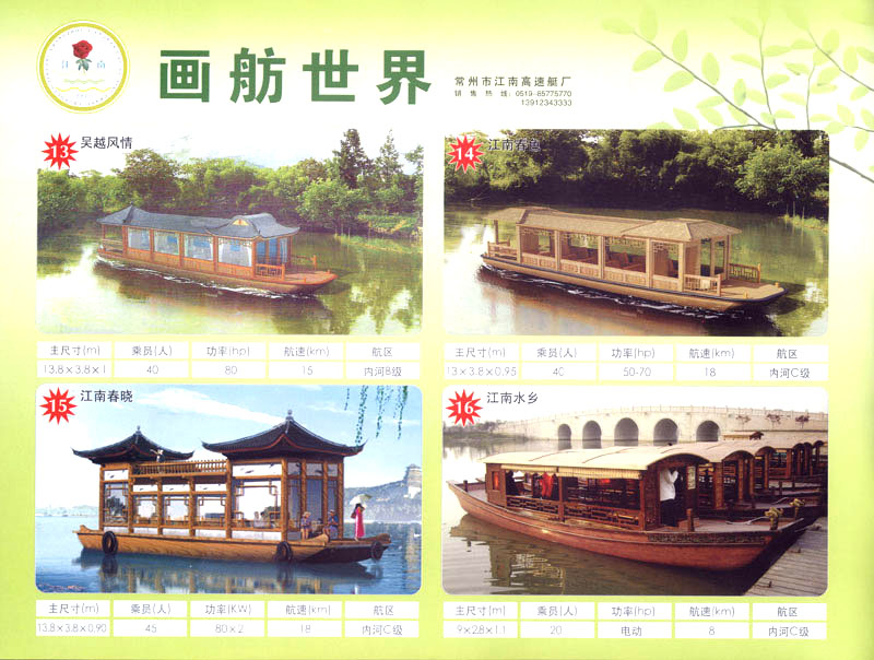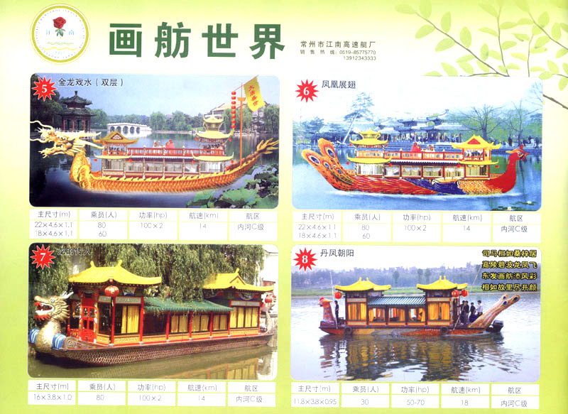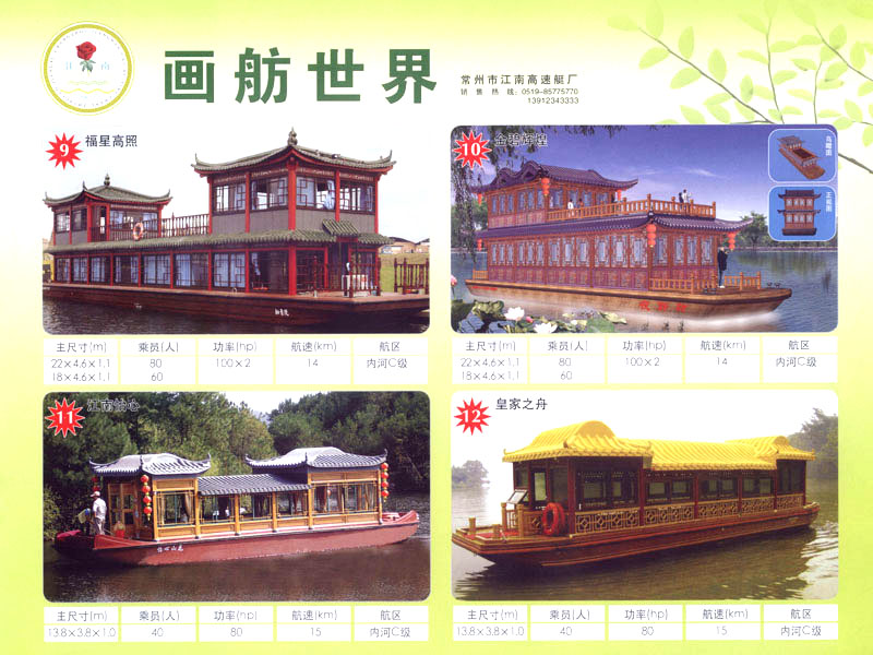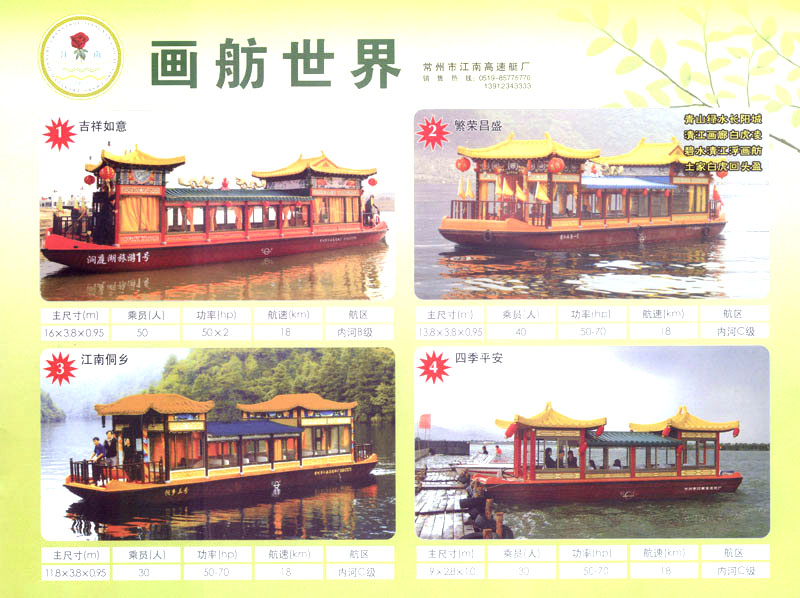 隨著人民生活的提高和水上旅游業(yè)的不斷發(fā)展,原有的游艇已遠不能滿足人民群眾不斷提高的需求。為適應水上旅游業(yè)市場的變 化,我廠開發(fā)研制了符合中國國情、具有民族特色的仿古畫舫游艇及國際最新流行款式一城市旅游休閑觀光艇。特別近兩年又開發(fā)了一批精品畫舫船投放市場之后深受景區(qū)的歡迎。今年我廠又開發(fā)了適用少數(shù)民族的“風雨橋”、“寨門”畫舫艇。在湖南、廣西、云南、貴州深受愛戴。此艇別具風格,民族風情特別濃厚。侗鄉(xiāng)一號計劃在2006年5月1日投放在貴州黎平侗鄉(xiāng)風景區(qū)八舟河景區(qū)使有(風序號)。我廠歡迎用戶來圖加工,來廠考察訂貨,畫舫艇款式多多,終有一款適合你。歡迎來電來函垂詢。索樣即寄。誠心銷售、人情化服務、企業(yè)文化、精品畫舫。