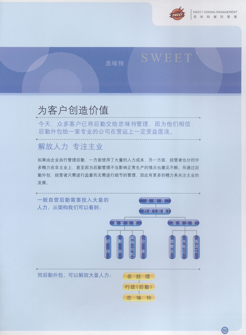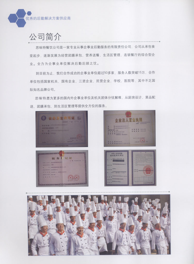常州市思味特餐飲有限公司是一家專業(yè)從事企事業(yè)后勤服務(wù)的有限責(zé)任公司,公司從承包食堂起步,逐漸發(fā)展為經(jīng)營(yíng)團(tuán)膳承包、營(yíng)養(yǎng)送餐、生活區(qū)管理、連鎖餐廳的綜合型企業(yè)。2008年公司斥資100萬(wàn)元,在常州興建了可以同時(shí)提供3000餐膳食的中央廚房,重點(diǎn)打造“和美客”后勤服務(wù)品牌,全力為企事業(yè)單位解決后勤后顧之憂。
