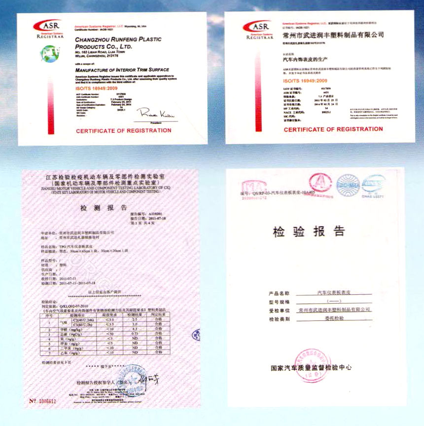 常州市武進(jìn)潤(rùn)豐塑料制品有限公司地處風(fēng)景美麗經(jīng)濟(jì)發(fā)達(dá)的長(zhǎng)江三角洲常州市東郊禮嘉鎮(zhèn),公司占地面積約8000平方米,且地理位置優(yōu)越,是中外客商常涉之地。 本公司專業(yè)生產(chǎn)汽車儀板軟化表皮、PVC門護(hù)板表皮、PVC復(fù)合制品、壓延薄膜制品,(塑料制品除醫(yī)用塑料制品),車輛零部件,機(jī)械電器零部件,電子元件,沖壓件制造,加工無(wú)妨制品,玻纖氈(GFP板),麻氈板等。本公司的產(chǎn)品在國(guó)內(nèi)一線乘用車上廣泛使用。產(chǎn)品通過國(guó)家汽車質(zhì)量監(jiān)督檢驗(yàn)中心檢測(cè),并取得了各種證書,如亞瑟國(guó)際認(rèn)證;ISO/TS1694:2009等。 本公司技術(shù)力量雄厚,生產(chǎn)設(shè)備先進(jìn)。多年來(lái),建立了較完善的質(zhì)量管理體系,以先進(jìn)的檢測(cè)技術(shù),優(yōu)質(zhì)的服務(wù)態(tài)度,向客戶提供最優(yōu)秀的產(chǎn)品,在同行中享有良好的聲譽(yù)。 歡迎新老客戶來(lái)公司指導(dǎo),洽談,合作。