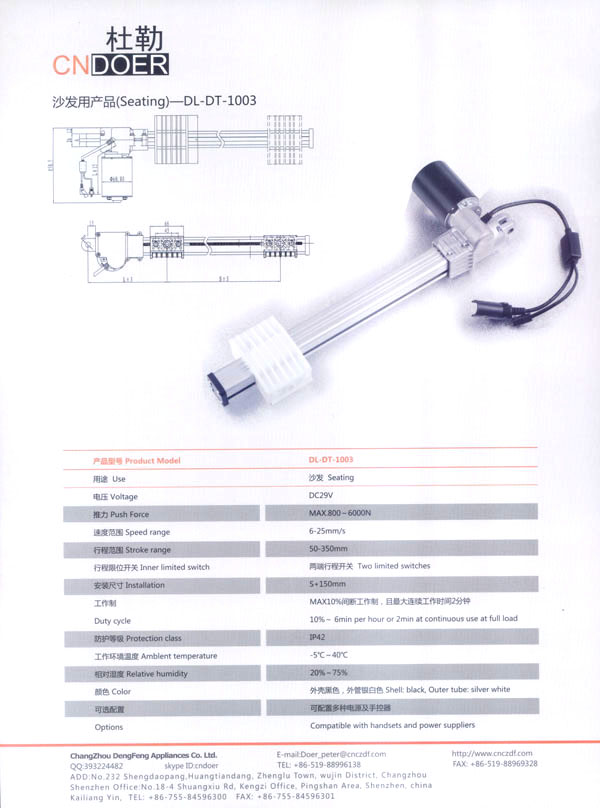 常州登豐電氣有限公司位于人杰地靈的江南古城—常州武進(jìn)區(qū)鄭陸鎮(zhèn)東青。緊臨常州火車站、滬寧高速公路、312國道、長江港等,交通十分便捷。 公司最早創(chuàng)辦于1989年,歷經(jīng)20多年的艱苦創(chuàng)業(yè),本著“誠信為本、品質(zhì)至上”的經(jīng)營理念,公司生產(chǎn)的“武微”牌空調(diào)電機(jī)、“蘇杰”牌電動(dòng)車電機(jī)和采用國外先進(jìn)技術(shù)制作的動(dòng)力強(qiáng)勁、同時(shí)具有過載保護(hù)和消音裝置的綠色環(huán)保產(chǎn)品:“登豐”、“聚美”牌食物垃圾處理器。這些產(chǎn)品在全國各地市場均享有較高的知名度。 如今,公司為謀求新的發(fā)展,立足于國內(nèi),放眼于國際市場,投入了大量的人力、財(cái)力、物力,購置了先進(jìn)的全自動(dòng)生產(chǎn)流水線、全自動(dòng)繞線機(jī)和各類精密的測試儀器,多功能隔音房等設(shè)施,全新推出了具有美好前景和廣闊市場的主打產(chǎn)品:“杜勒”牌系列線性推桿及各類配套電機(jī)。該產(chǎn)品已通過ISO9001認(rèn)證,產(chǎn)品外觀新穎、制作精良、噪音小、操作靈活簡便,暢銷國內(nèi),遠(yuǎn)銷國外,被廣泛應(yīng)用于電動(dòng)沙發(fā)、醫(yī)療護(hù)理床、手術(shù)床、按摩椅等眾多領(lǐng)域!岸爬铡碑a(chǎn)品已被越來越多的客戶所青睞和認(rèn)可! 公司竭誠歡迎各界朋友、新老客戶前來洽談合作,共謀發(fā)展。我們也將不斷開拓創(chuàng)新,提高產(chǎn)品質(zhì)量,完善售后服務(wù)體系,努力打造成為行業(yè)先鋒企業(yè)!