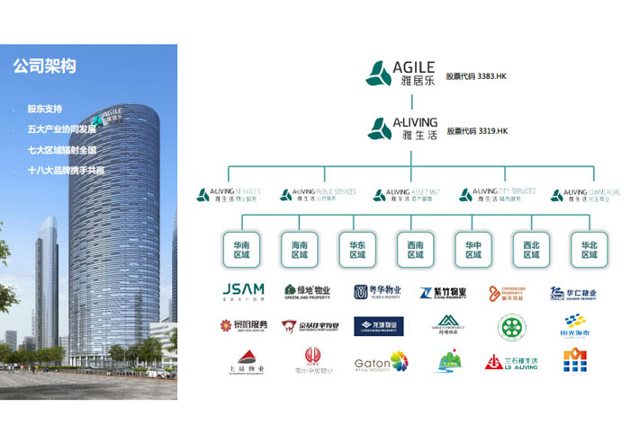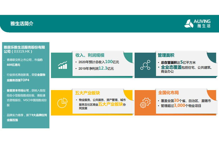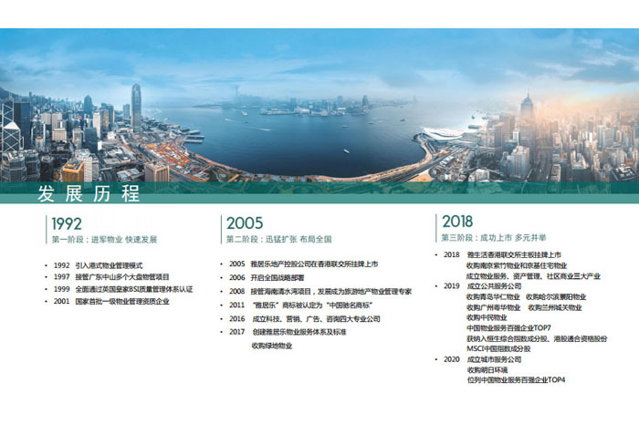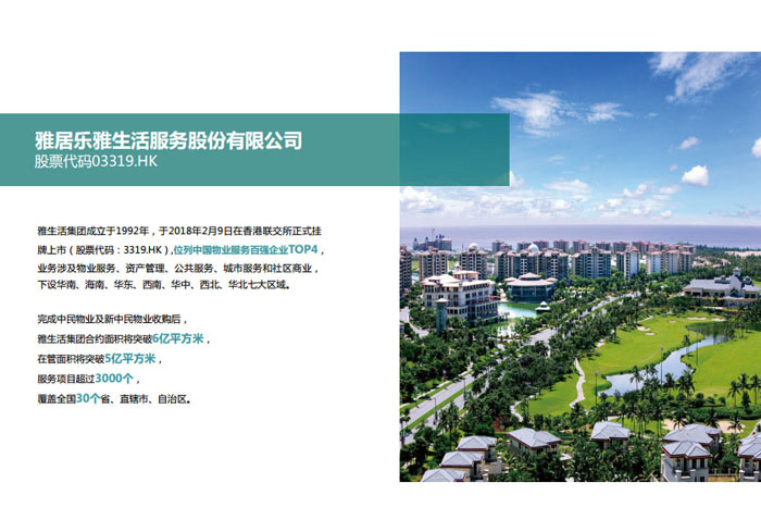 一、立足北上廣,面向全中國,走向全世界 1992年,雅居樂物業(yè)開篇中山,率先引入港式物業(yè)管理模式。1997年,依托雅居樂地產(chǎn)的崛起,連續(xù)接管中山多個項目,成為高端大盤物業(yè)管理的領(lǐng)跑者。1999年,雅居樂物業(yè)開啟專業(yè)化發(fā)展模式,全面通過英國皇家BSI的ISO9000質(zhì)量管理體系認證,2001年成為國家首批一級物業(yè)管理資質(zhì)企業(yè)。 2002年,隨著廣州雅居樂花園的盛大啟幕,雅居樂物業(yè)邁開向廣州進軍的步伐。為尋求更長遠的發(fā)展,雅居樂積極構(gòu)思上市藍圖,2005年在香港成功上市。在深耕珠三角城市群的同時,2006年雅居樂物業(yè)揮師北上,正式開啟全國部署戰(zhàn)略。2008年,接管海南清水灣項目,揭開旅游地產(chǎn)物業(yè)管理的新篇章。 接下來近十年里,雅居樂物業(yè)始終保持著最年輕的成長姿態(tài),依托“管理數(shù)字化、服務專業(yè)化、流程標準化和操作機械化”的發(fā)展戰(zhàn)略,雅居樂物業(yè)榮膺2018中國物業(yè)服務百強企業(yè)第11名,2018年中國物業(yè)服務百強企業(yè)成長性第二名、2018年中國物業(yè)服務百強服務質(zhì)量領(lǐng)先企業(yè)、2018年中國物業(yè)服務百強滿意度領(lǐng)先企業(yè)、2018中國物業(yè)服務百強經(jīng)營績效領(lǐng)先企業(yè)、旅游地產(chǎn)物業(yè)管理領(lǐng)先品牌、2018年中國辦公物業(yè)管理優(yōu)秀企業(yè)(綠地物業(yè))、2017中國物業(yè)管理企業(yè)品牌價值第12名、2017中國物業(yè)管理企業(yè)綜合實力第12名、中國藍籌物業(yè)企業(yè)、《旅游地產(chǎn)物業(yè)管理服務標準》(團體標準)起草工作等多項殊榮。 目前,雅生活集團已形成廣州、中山、深圳、南京、上海、西安、成都、海南、云南、北京、鄭州、南寧、沈陽、武漢、馬來西亞十五大城市公司全面發(fā)展的蓬勃態(tài)勢。截止2017年12月31日,雅生活集團管理范圍覆蓋全國逾69座城市與地區(qū),服務類型涵蓋主流住宅、高端豪宅、旅游地產(chǎn)、商業(yè)、寫字樓等多種業(yè)態(tài),合約總建筑面積為12610萬平方米,擁有200多個項目,服務業(yè)主逾100萬人。 2017年6月,雅生活集團收購綠地物業(yè)100%股權(quán),并與綠地集團簽署戰(zhàn)略合作協(xié)議,8月,綠地集團投資10億元獲得雅生活集團20%股權(quán)。未來,雅生活集團將實施“雅居樂物業(yè)”與“綠地物業(yè)”雙品牌驅(qū)動戰(zhàn)略,還將尋求在A股上市,力爭打造中國物業(yè)“A+H”第一股。