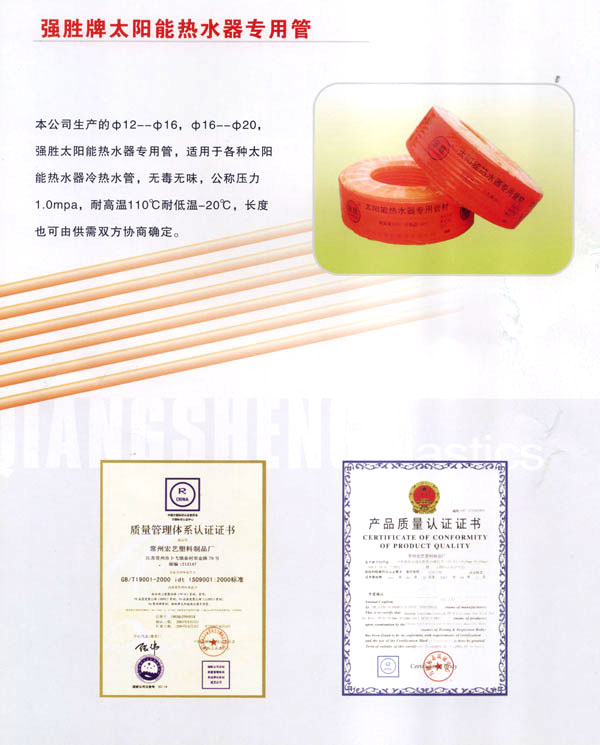 本公司是改革開放初期成立的獨(dú)資私營企業(yè)。二十余年來,本廠在尊重 科學(xué)、尊重人才、加強(qiáng)技改、狠抓管理的基礎(chǔ)上使企業(yè)不斷地發(fā)展壯大。目前,本廠擁有22條先進(jìn)水平地單螺桿擠出機(jī)生產(chǎn)線,2條生產(chǎn)大口徑PP管地生產(chǎn)線,8臺電腦注塑機(jī),以及全套精密地檢測設(shè)備和高素質(zhì)地檢測人員,確保了產(chǎn)品質(zhì)量。年生產(chǎn)能力達(dá)6000噸,成為各種塑料管道地專業(yè)生產(chǎn)廠家。 我們的主要產(chǎn)品有: 給水用三型聚丙烯(PP-R)管材、管件;PE高密度聚乙烯(HDPE)管材;PE低密度聚乙烯(LLDPE)管材;PP聚乙烯管材;強(qiáng)勝牌太陽能熱水器專用管。 產(chǎn)品廣泛用于城鄉(xiāng)水改、郵電通信、高壓供電、市政改造、路燈管理、鑿井挖泥、航道疏竣、選礦尾砂填充、環(huán)保、化工、輕工等行業(yè)。 本廠生產(chǎn)的各類管材及管件,吸收國內(nèi)外同類產(chǎn)品的精華,設(shè)計(jì)先進(jìn),結(jié)構(gòu)合理,選料科學(xué),質(zhì)量執(zhí)行國家標(biāo)準(zhǔn),產(chǎn)品歷年經(jīng)國家塑料制品質(zhì)量監(jiān)督檢驗(yàn)中心檢驗(yàn)合格。 我們始終秉承“以人品塑造產(chǎn)品”的理念,以科學(xué)提升品質(zhì)、與時俱進(jìn),以強(qiáng)大的研發(fā)能力,高質(zhì)量的提供新型的環(huán)保產(chǎn)品,回報(bào)社會各界的支持!