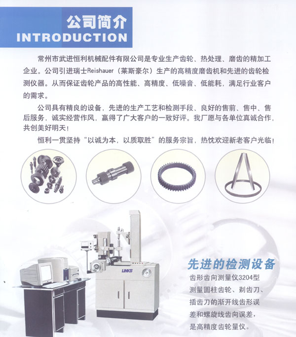 常州市武進(jìn)恒利機(jī)械配件有限公司是專(zhuān)業(yè)生產(chǎn)齒輪、熱處理、磨齒的精加工企業(yè)。公司引進(jìn)瑞士Reishauer(菜斯豪爾)生產(chǎn)的高精度磨齒機(jī)和先進(jìn)的齒輪檢測(cè)儀器。從而保證齒輪產(chǎn)品的高-性能、高精度、低噪音、低能耗,滿足行業(yè)客戶(hù)的需求。 公司具有精良的設(shè)備,先進(jìn)的生產(chǎn)工藝和檢測(cè)手段、良好的售前、售中、售后服務(wù),誠(chéng)實(shí)經(jīng)營(yíng)作風(fēng),贏得了廣大客戶(hù)的一致好評(píng)。我廠愿與各單位真誠(chéng)合作,共創(chuàng)美好明天! 恒利一貫堅(jiān)持“以誠(chéng)為本,以質(zhì)取勝”的服務(wù)宗旨,熱忱歡迎新老客戶(hù)光臨!