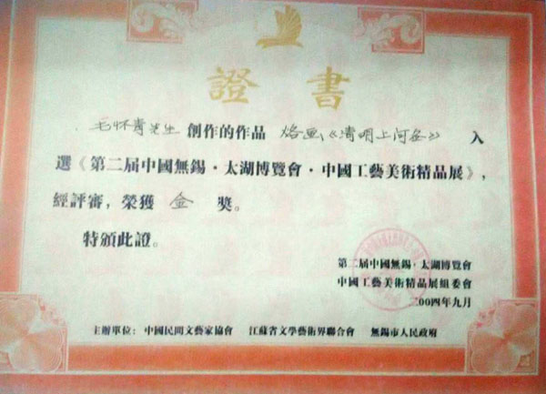 毛懷青,江蘇常州市武進人。 中國工藝美術(shù)學會會員,常州市中國烙畫研究會副會長,常州市文博鑒賞協(xié)會理事,非物質(zhì)文化遺產(chǎn)烙畫傳承人。高級工藝美術(shù)師。 年輕時學習國畫、油畫中年蔓現(xiàn)掌州咯畫源遠流長、歷史悠久,有著其它美術(shù)門類不具備的藝術(shù)風格與特色?芍^是工藝美術(shù)中的一朵十分亮麗的藝術(shù)奇葩,是我民族先人給我們留下的一份不可多得十分珍貴的一份文化遺產(chǎn)。為弘揚與發(fā)展這份優(yōu)秀文化遺產(chǎn),我從此下定決心研究烙畫,愿付出一份力量為振興烙畫事業(yè)做出貢獻。至今已潛心研究幾十年,取得了可喜的成績,被業(yè)界公認,社會關(guān)注與認可。有“江南烙畫第一筆”之美譽。 近年來,創(chuàng)作的烙畫作品分別獲得過全國、省市級的金、銀、銅獎多次。中央電視臺曾兩次播放過本人的烙畫作品,江蘇電視臺、常州電視臺也曾多次播放過本人的作品與烙畫藝術(shù)生涯,揚子晚報、常州日報、常州晚報也曾多次報導過本人的烙畫作品,出版物有三種版本都能查閱到介紹本的烙畫從藝生涯與藝術(shù)業(yè)績。