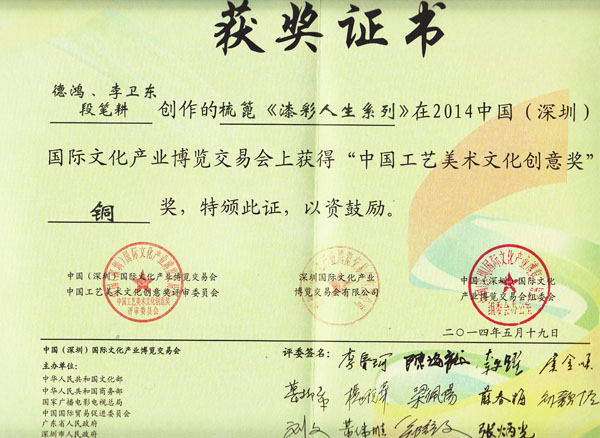 2014中國(深圳)國際文化產(chǎn)業(yè)博覽交易會,徐德鴻、李衛(wèi)東、段筆耕《漆彩人生系列》獲得“中國工藝美術(shù)文化創(chuàng)意獎”銅獎