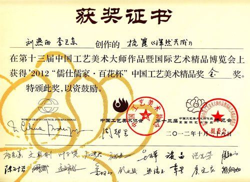 “第十三屆中國工藝美術(shù)大師作品暨國際藝術(shù)精品博覽會”, 虞美人《渾然天成》榮獲2012“儒士儒家•百花杯”中國工藝美術(shù)精品獎金獎