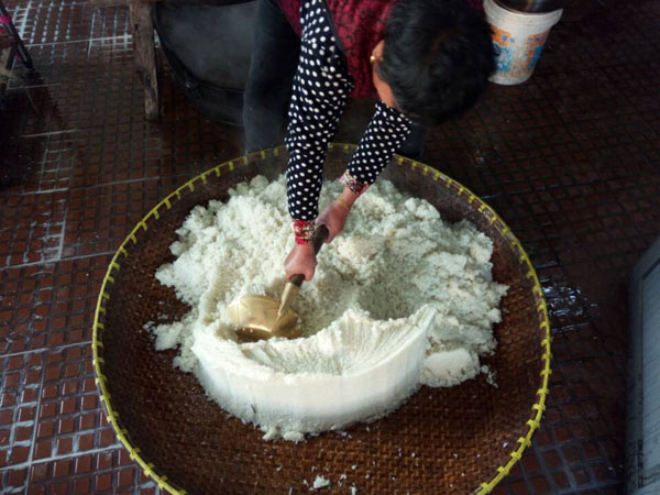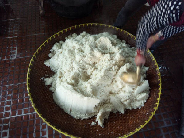 第三步:拌入酒曲,這時(shí)候才發(fā)現(xiàn)了“木桶”的神奇之處:一頭空,另一頭也是空,只不過用鋼筋做了個(gè)柵欄。之前蒸米飯,老徐是墊上了蒲草,一方面讓糯米飯更易熟,另一方面也增加了糯米飯的清香氣息。把糯米飯倒入蠶匾中,邊翻動(dòng)糯米飯邊撒上酒曲,使酒曲與糯米飯充分拌勻。