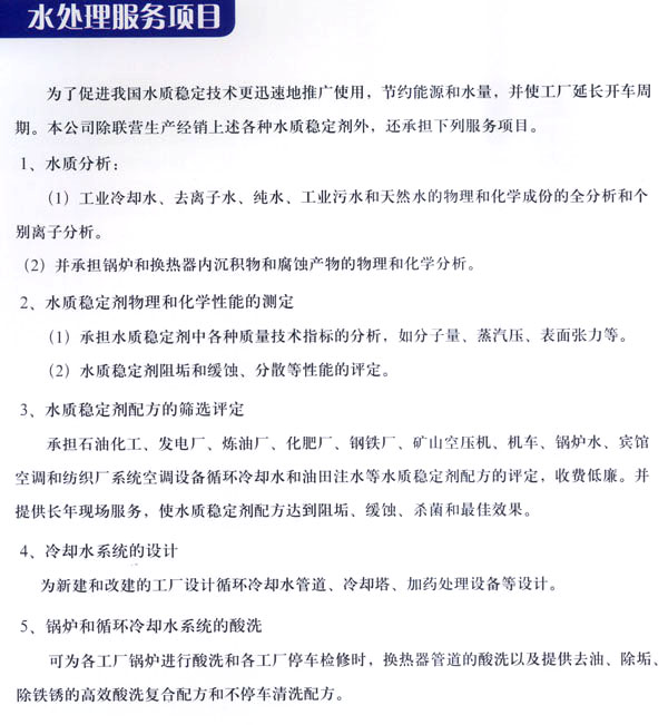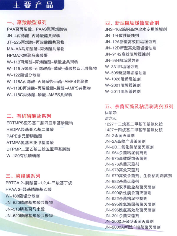 企業(yè)運(yùn)用嚴(yán)密的科學(xué)管理,配有先進(jìn)的工藝技術(shù)和精良的生產(chǎn)裝備,保持高標(biāo)準(zhǔn)的產(chǎn)品質(zhì)量。所生產(chǎn)的水質(zhì)穩(wěn)定劑達(dá)到或超過國際先進(jìn)水平,擁有PBTCA等多個(gè)江蘇省高新技術(shù)產(chǎn)品,DPSC緩蝕阻垢劑被列為國家星火計(jì)劃項(xiàng)目,工業(yè)循環(huán)水用新型緩蝕阻垢殺菌劑被國務(wù)院評為國家科技進(jìn)步二等獎(jiǎng)。主要產(chǎn)品均通過部、省級科技成果鑒定,連續(xù)十多年被中國石化總公司評定為合格推薦產(chǎn)品。企業(yè)已通過IS09001、IS014001國際質(zhì)量、環(huán)境認(rèn)證,為國內(nèi)外石化行業(yè)、冶金、鋼鐵、化肥、電力、紡織等領(lǐng)域的工業(yè)循環(huán)冷卻水的水質(zhì)處理提供了必不可少的配套產(chǎn)品。