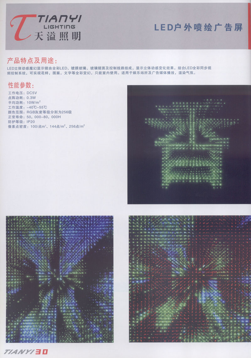 天溢照明是中國(guó)領(lǐng)先的專(zhuān)業(yè)從事LED廣告照明裝飾燈具設(shè)計(jì)、系統(tǒng)開(kāi)發(fā)、燈具制造、工程服務(wù)一體的專(zhuān)業(yè)型公司,本公司產(chǎn)品已廣泛應(yīng)用于全國(guó)大多數(shù)城市夜景亮化景觀照明、酒店休閑娛樂(lè)夜場(chǎng)夢(mèng)幻燈光、戶(hù)內(nèi)外廣告宣傳、建筑及室內(nèi)照明以及家居裝飾等場(chǎng)合。 本公司產(chǎn)品涵蓋景觀裝飾照明、商用照明、居家照明、信息廣告顯示等領(lǐng)域,我們將性能可靠與適中價(jià)格的LED全系列產(chǎn)品帶到世界各個(gè)、角落。